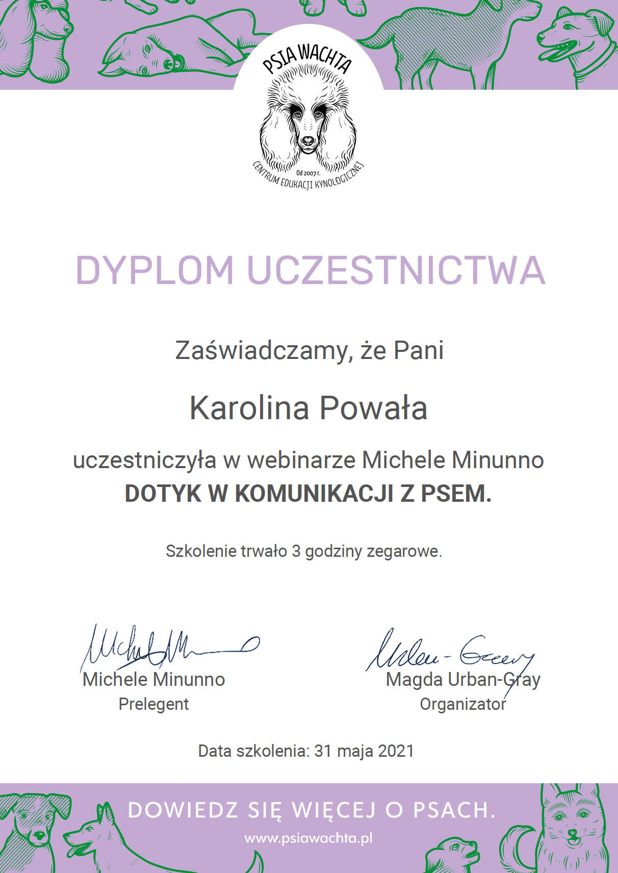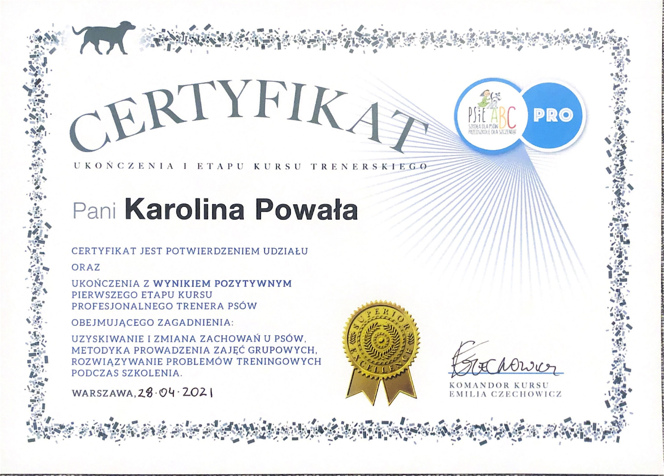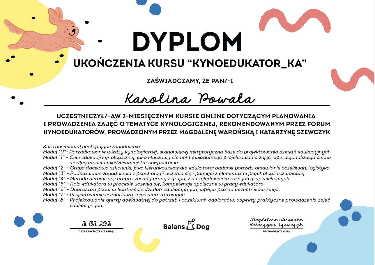 Ukończyłam również kurs Kynoedukatorki, który był prowadzony przez Magdalenę Warońską ze szkoły ScentMind. Dzięki temu, zrozumiałam między innymi jak ogromny wpływ na współpracę z moimi klientami ma sposób przekazywania wiedzy oraz zarządzanie sesją treningową.