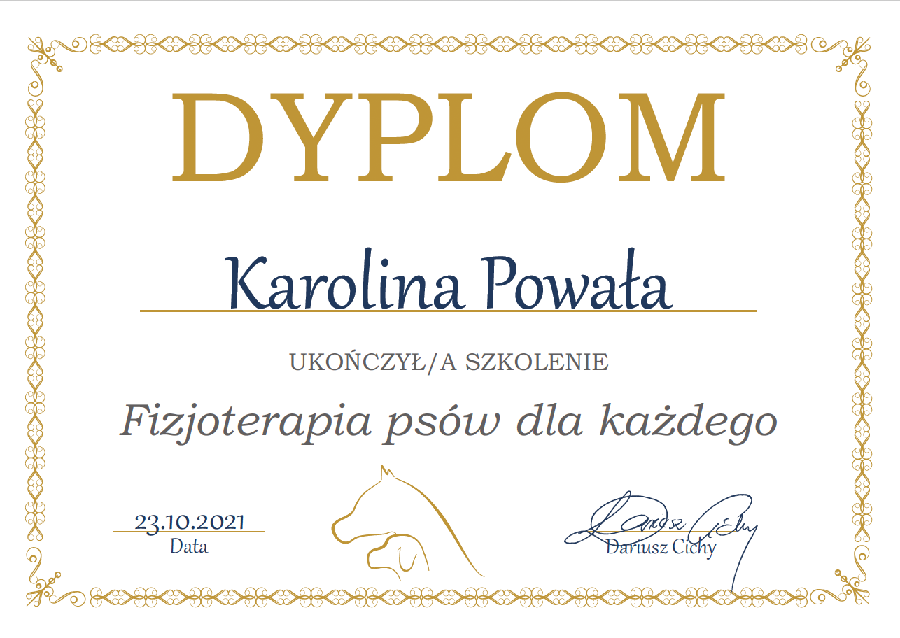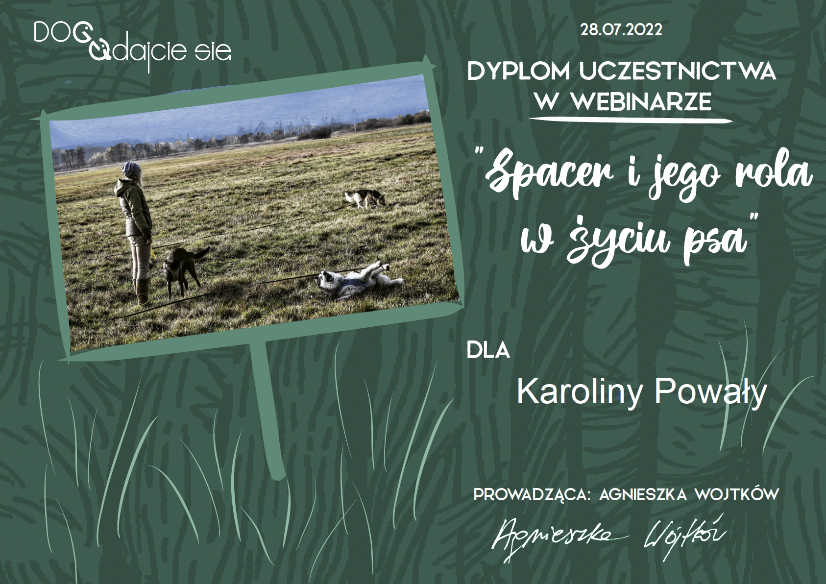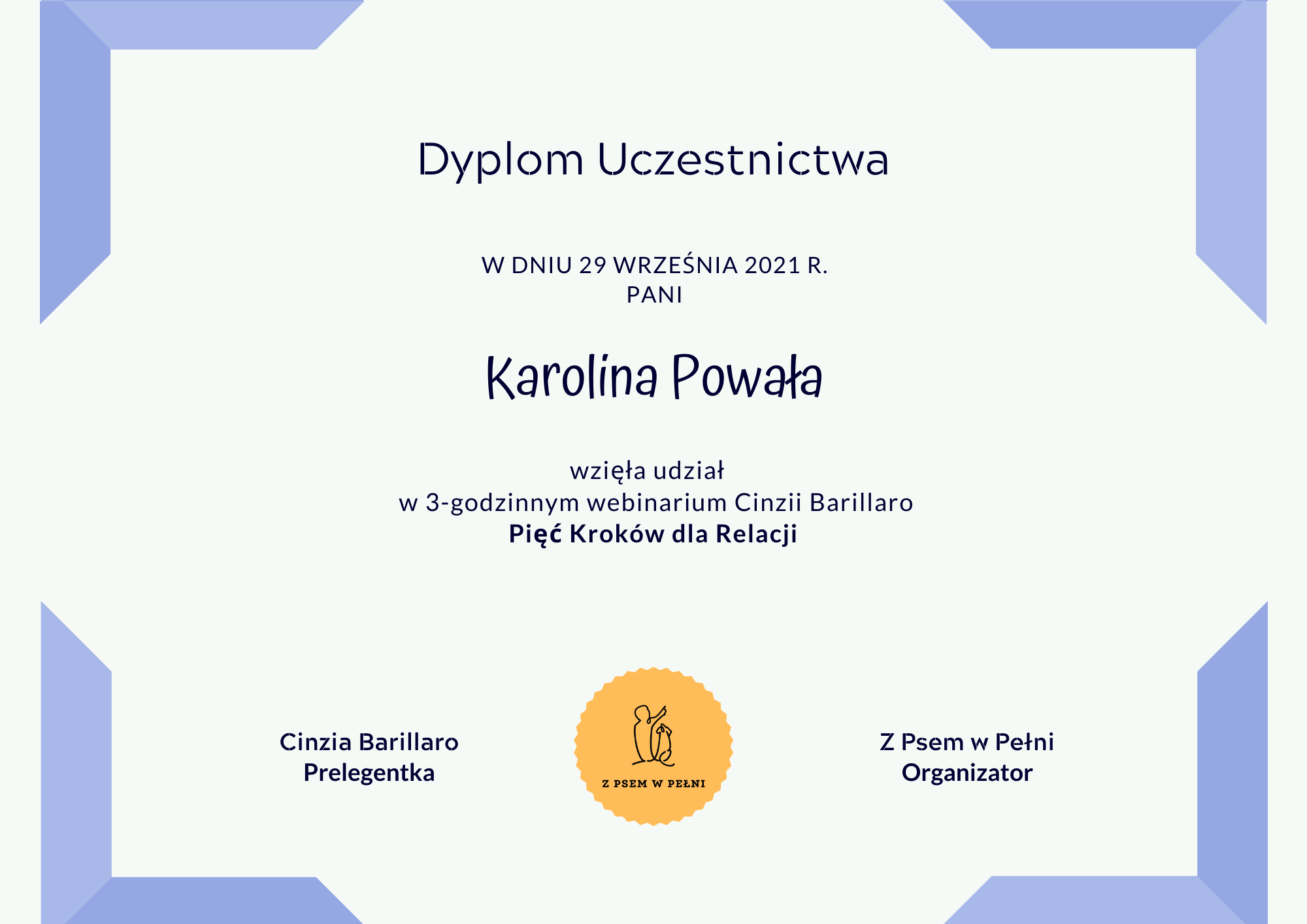 Ukończyłam również kurs Kynoedukatorki, który był prowadzony przez Magdalenę Warońską ze szkoły ScentMind. Dzięki temu, zrozumiałam między innymi jak ogromny wpływ na współpracę z moimi klientami ma sposób przekazywania wiedzy oraz zarządzanie sesją treningową.