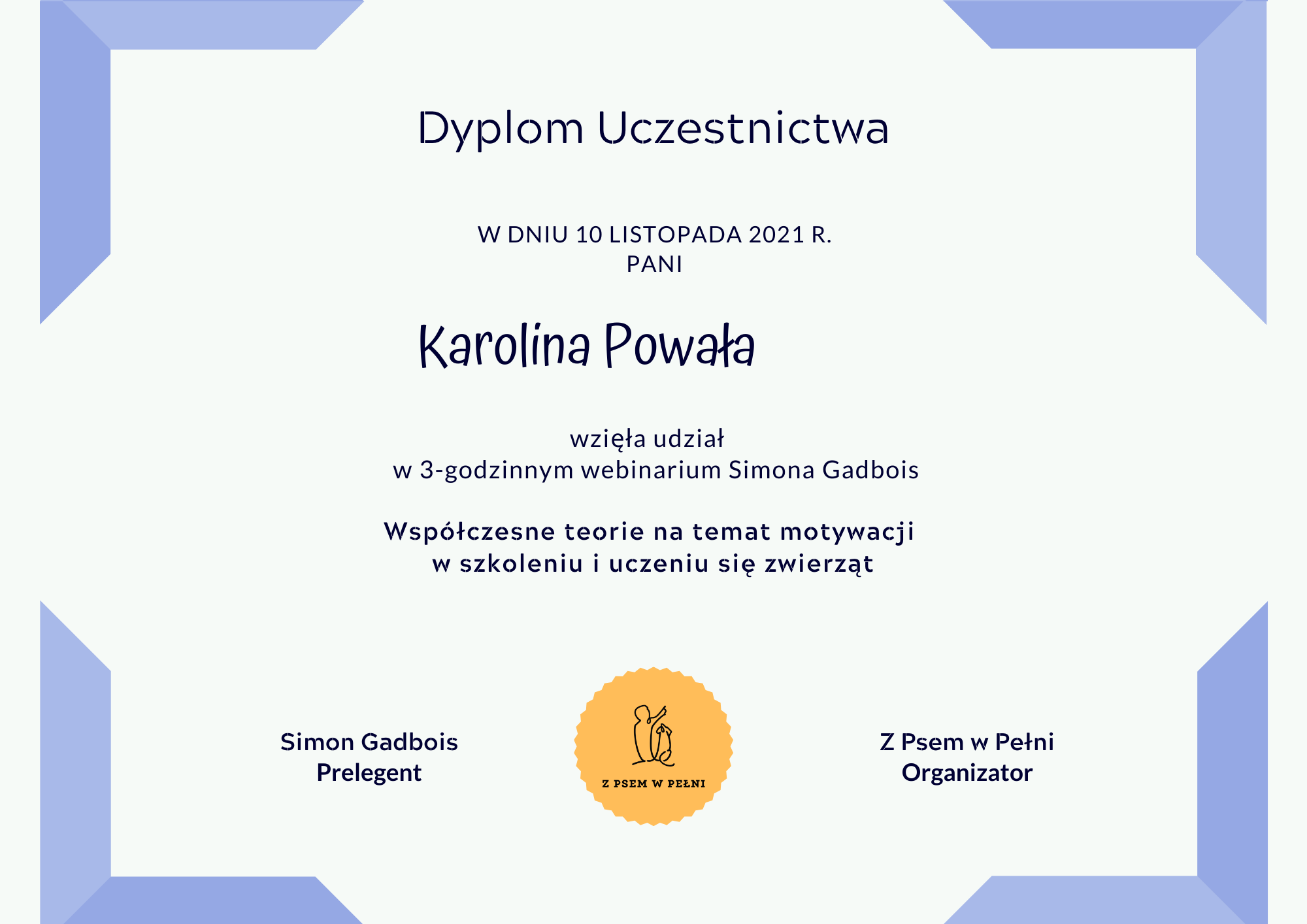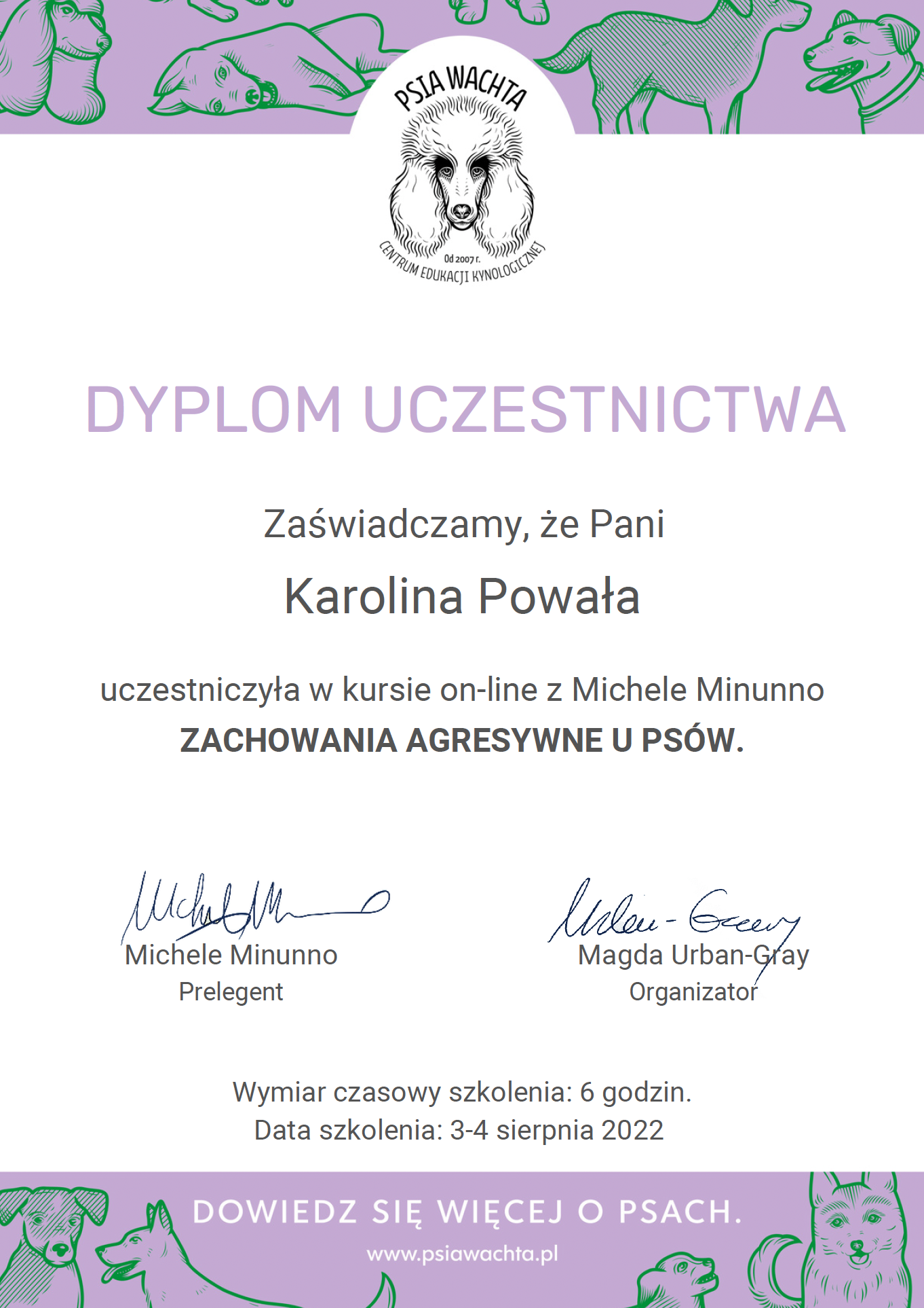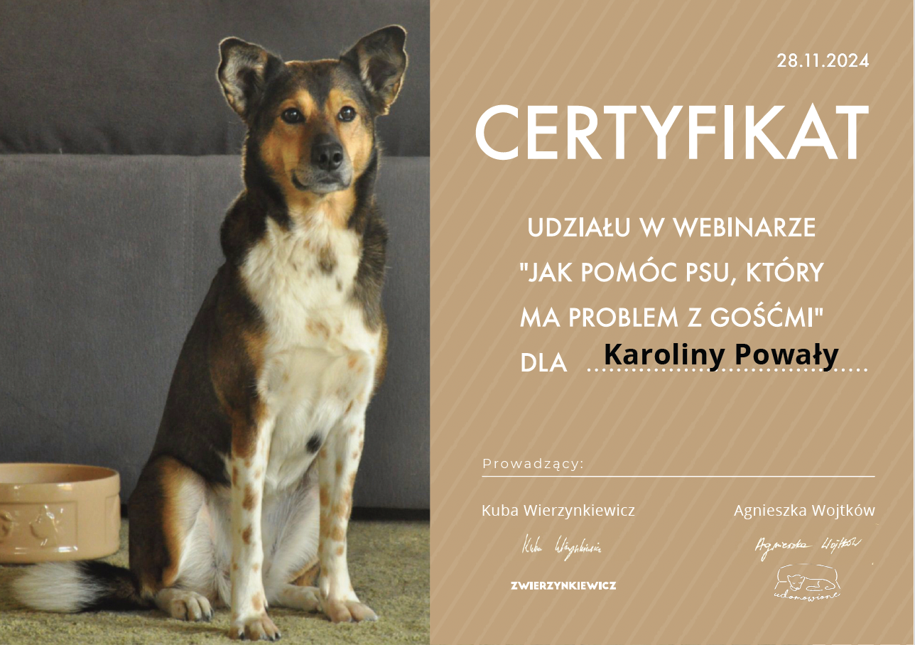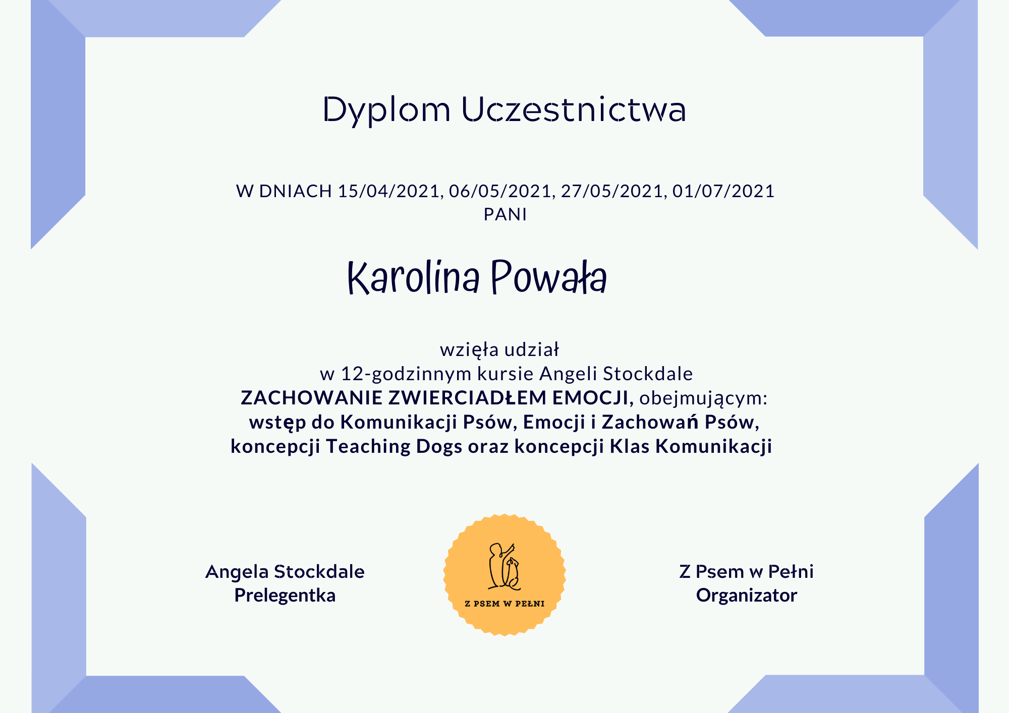 To co jest bliskie mojemu sercu to podejście oraz filozofia Kasi i Ani – “Z Psem w pełni”, u których ukończyłam różne kursy, seminaria oraz webinary ich zagranicznych specjalistów.